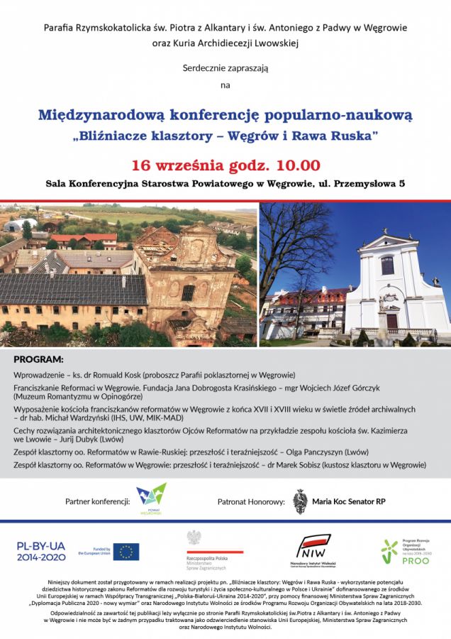 Niniejsza strona internetowa została stworzona i utrzymywana przy pomocy finansowej Unii Europejskiej. Odpowiedzialność za jej zawartość leży wyłącznie po stronie Parafii Rzymskokatolickiej św. Piotra z Alkantary i św. Antoniego z Padwy w Węgrowie oraz Archidiecezji Lwowskiej Kościoła Łacińskiego na Ukrainie i nie może być w żadnym przypadku traktowana jako odzwierciedlenie stanowiska Unii Europejskiej